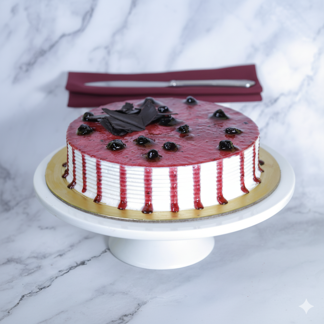 Experience a burst of berry delight with our captivating Blueberry Drip Cake! This exquisite creation features a pristine white frosting base, elegantly textured around the sides. Cascading down the edges are luscious drips of vibrant blueberry glaze, adding a dramatic and mouth-watering touch. The top is generously adorned with a glistening layer of blueberry glaze, studded with plump, juicy blueberries, and finished with delicate dark chocolate curls or shards for a touch of sophisticated charm. Beneath this stunning presentation lies a moist and flavorful blueberry cake, promising an irresistible fusion of sweet and tangy berry goodness with every decadent slice. Perfect for any celebration craving a fruity, show-stopping dessert!