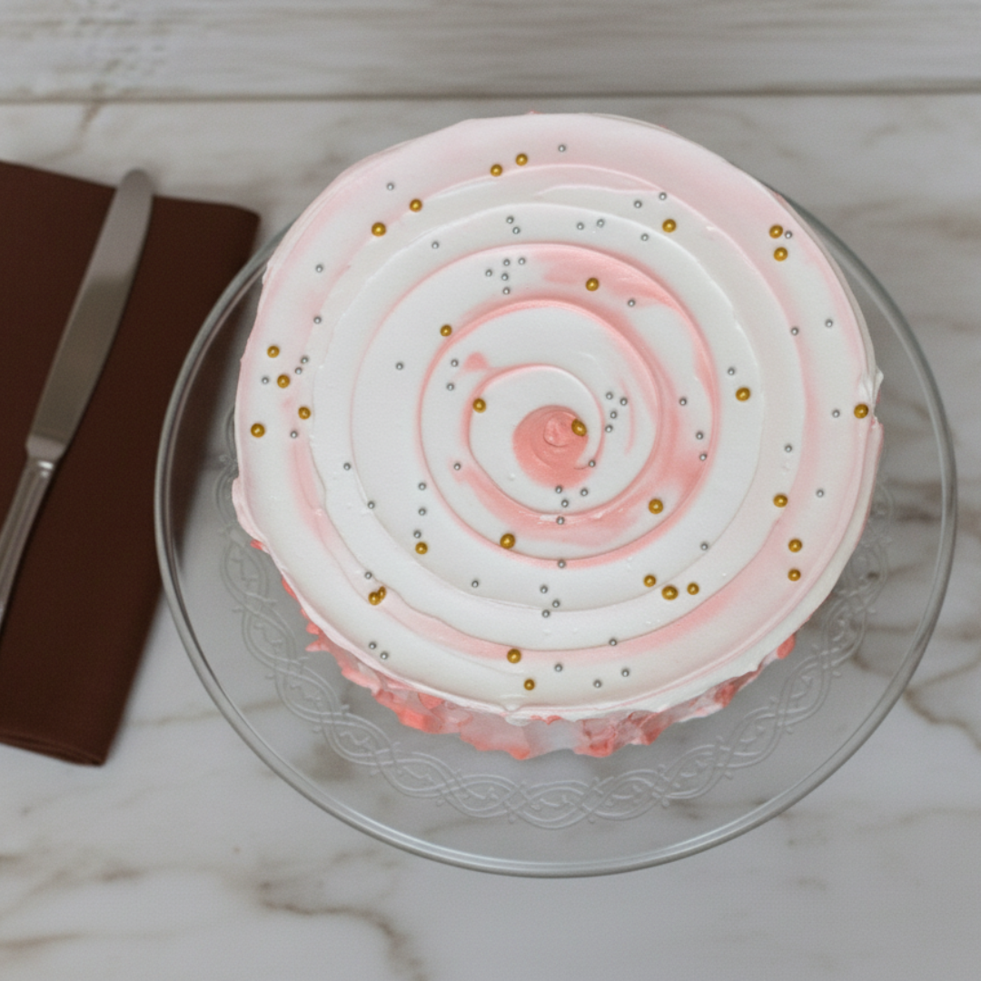 This is a delightful strawberry cake, beautifully decorated with a charming pink and white swirled frosting that evokes a sense of whimsy. The sides of the cake feature a textured, rustic frosting application, creating soft peaks and valleys in alternating shades of pink and white. The top surface is smoothly iced with an elegant white frosting, into which a delicate spiral pattern has been etched, drawing the eye towards the center. Scattered across the top are an array of small, shimmering gold and silver spherical sprinkles, adding a touch of sparkle and festivity to this inviting dessert.