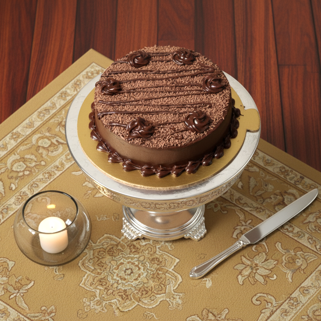 Our skilled bakers have crafted this gorgeous cake to perfection with an intricate layer of moist sponge cake, generously coated with a thick layer of pure Belgian chocolate truffle. The cake is delicately decorated with chocolate drops, adding an exquisite touch to its aesthetics and chocolate shavings put over the cake.