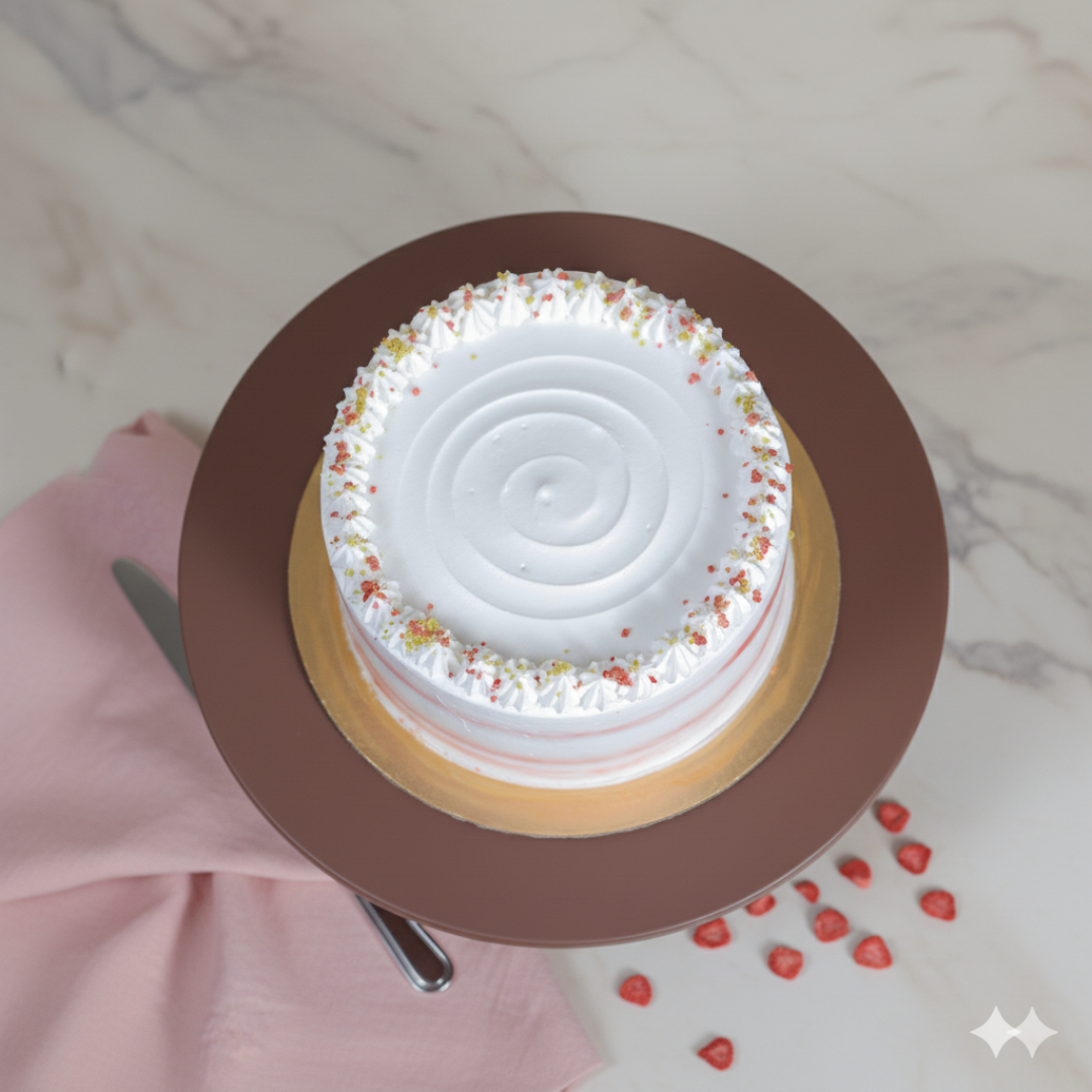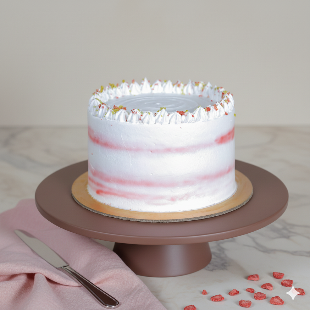 Indulge in a sweet symphony of flavors with our charming Swirl & Sprinkle Strawberry Cake! This delightful creation features a smooth white frosting, artfully swirled with soft bands of blush pink, hinting at the deliciousness within. The top is crowned with a delicate border of piped white frosting rosettes, beautifully finished with a vibrant dusting of colorful sprinkles for a festive touch. Beneath this inviting exterior lies a delectable strawberry cake, promising a burst of sweet, fruity flavor in every bite. Perfect for any occasion that calls for a fun and delicious celebration.