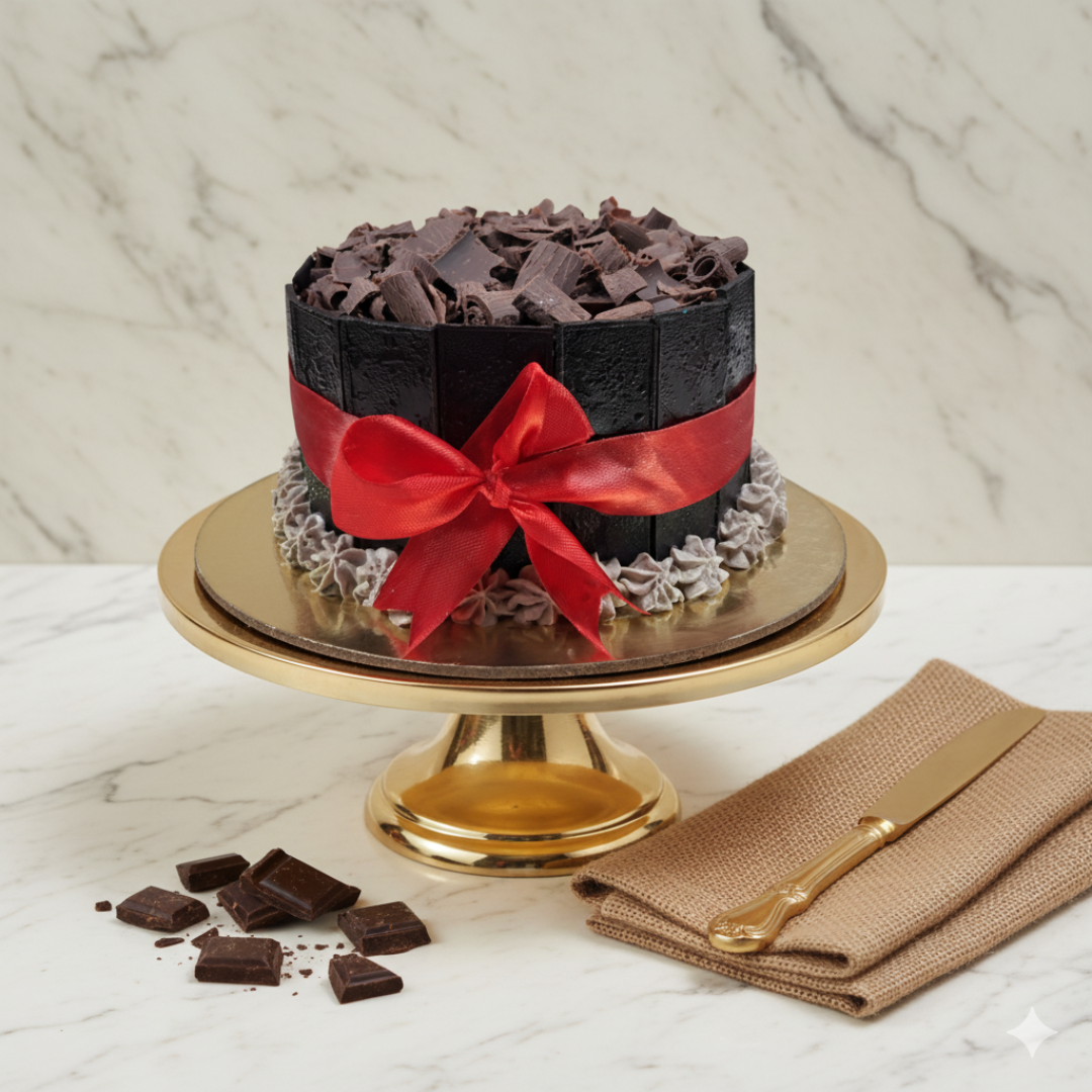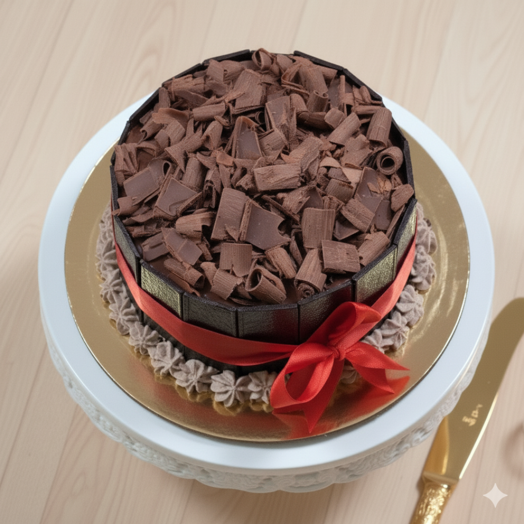 Prepare for a true masterpiece of indulgence with our Festive Shavings Belgian Chocolate Truffle Cake. At its heart lies a rich, dense truffle cake, boasting an intensely deep truffle sauce filling between the cake layers. The sides are elegantly structured with individual chocolate panels, creating a sophisticated “fence-like” framework, while a generous, inviting heap of delicate chocolate shavings crowns this magnificent creation, promising an abundance of rich chocolatey goodness and a delightful textural contrast with every bite. Finished with a vibrant ribbon, this cake embodies both grandeur and festivity, making it the perfect showstopper for any special occasion.