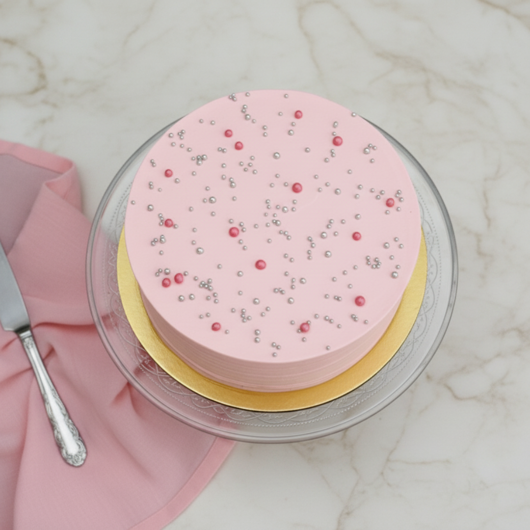 A sprinkle of joy in every bite! Our charming Strawberry Blush Cake is beautifully coated in a smooth, delicate pink frosting, evoking a sweet and inviting charm. The sides feature subtle horizontal textures, adding a touch of elegance, while the top is playfully adorned with a delightful scattering of silver and bright pink edible vegan pearls. This lovely cake isn’t just pretty; it’s a delicious strawberry cake inside, promising a burst of fruity flavor with every festive slice. Perfect for any celebration that calls for a touch of sweetness and sparkle!