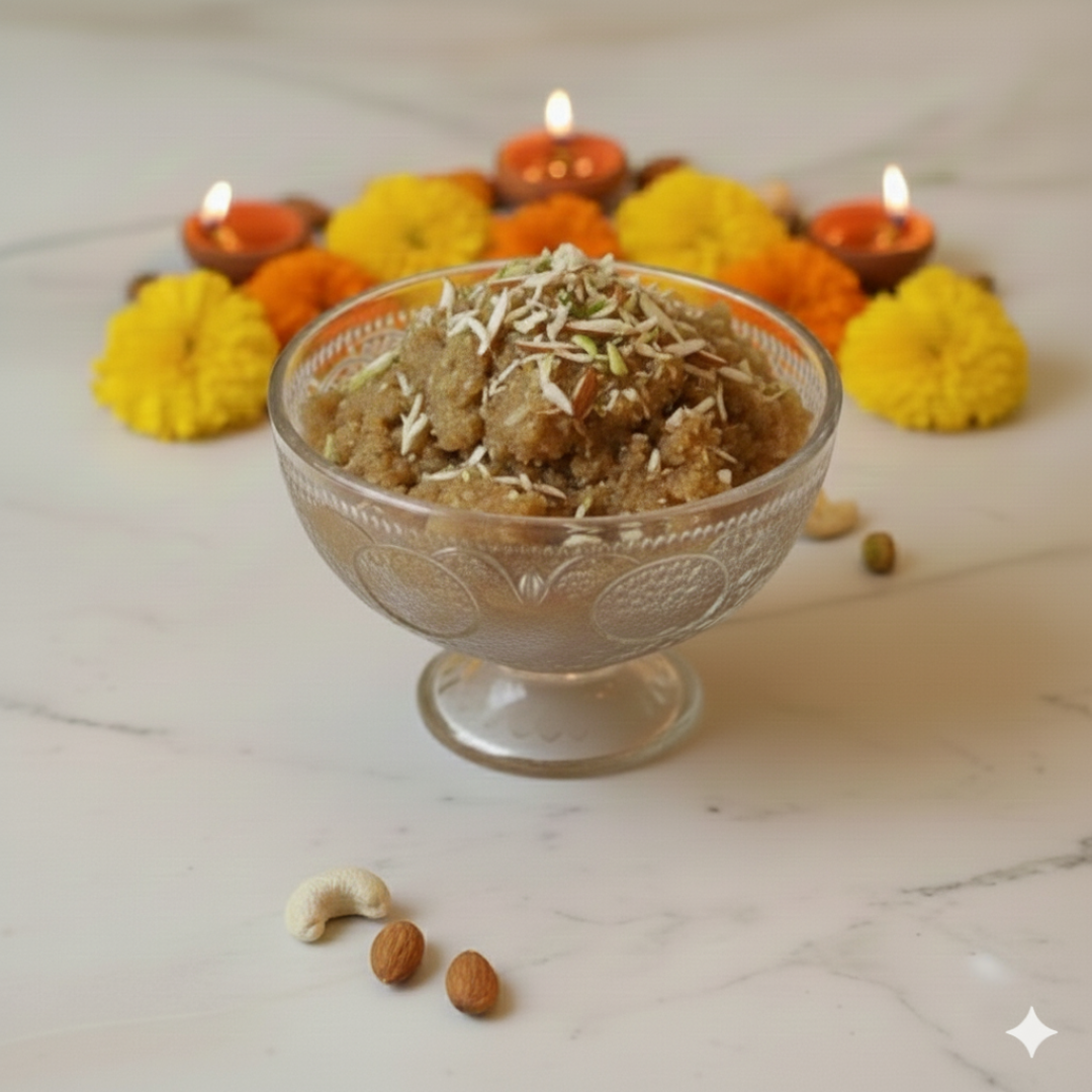 Awaken your senses with our luxurious Moong Dal Halwa, an Indian classic reimagined. Slow-cooked to a melt-in-your-mouth perfection, this dessert envelops you in a heavenly fragrance of deeply roasted moong dal, toasted nuts, and the delicate creaminess of vegan cashew nut butter. A sweet symphony of taste and texture that truly delights..