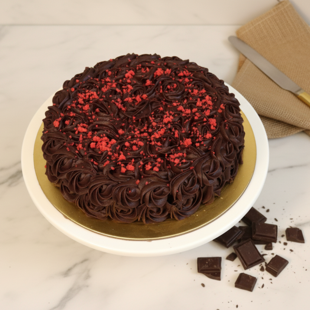 Indulge in pure luxury with this exquisite red velvet cake, reimagined for the ultimate chocolate lover. This rich delight features tender red velvet layers generously enrobed with luscious Belgian chocolate truffle sauce in between, creating an irresistible depth of flavor. The entire cake is crowned with elegant swirls of dark chocolate truffle frosting and finished with a scattering of vibrant red velvet crumbs, offering a sophisticated and decadent experience.