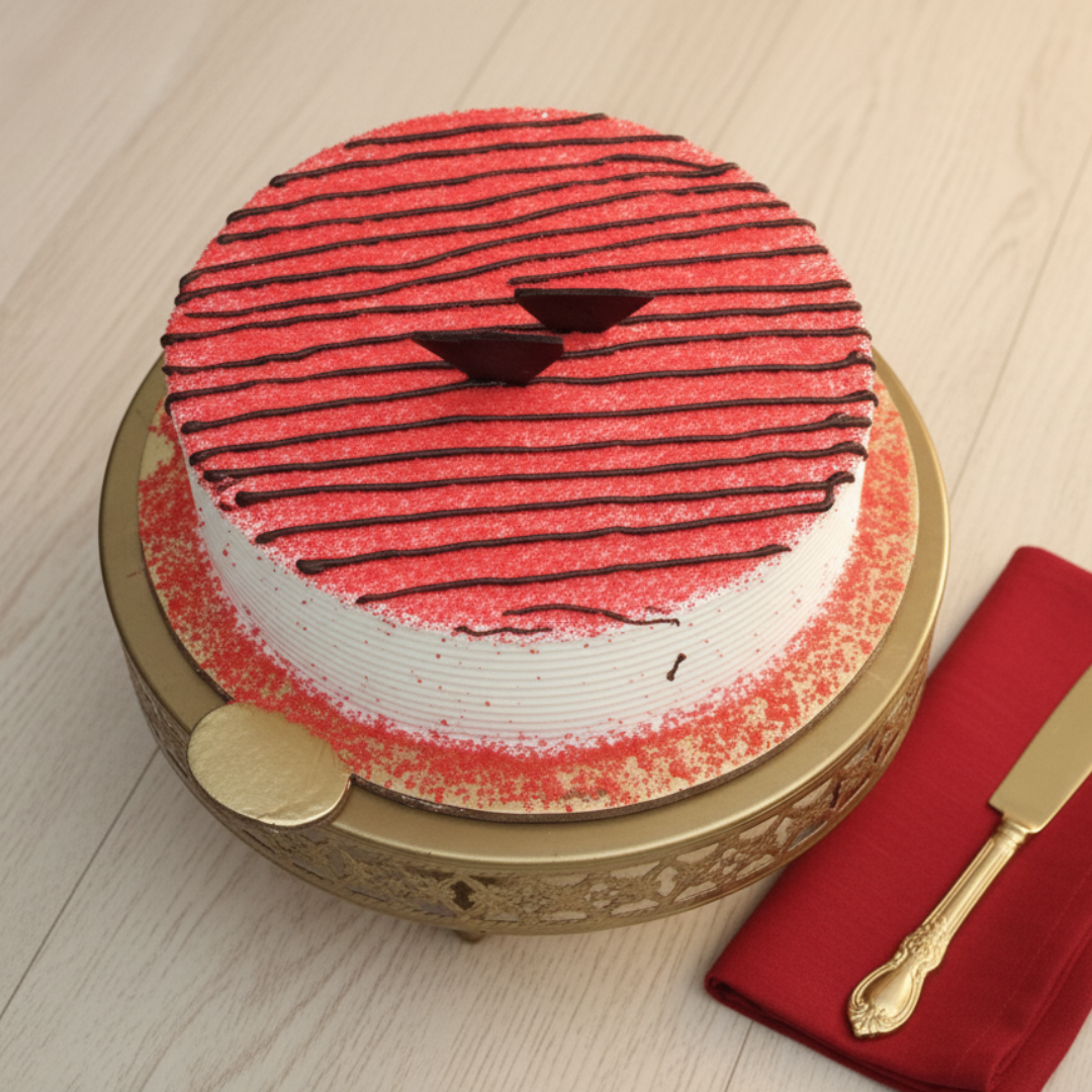 Presenting a modern take on a classic, this elegant red velvet cake is sure to impress. It features a beautifully ridged white frosting around the sides, creating a sophisticated texture. The top is a vibrant canvas of red velvet crumbs, artfully adorned with striking parallel lines of dark chocolate drizzle and crowned with two triangular chocolate pieces, adding a contemporary flair to this delicious treat.
