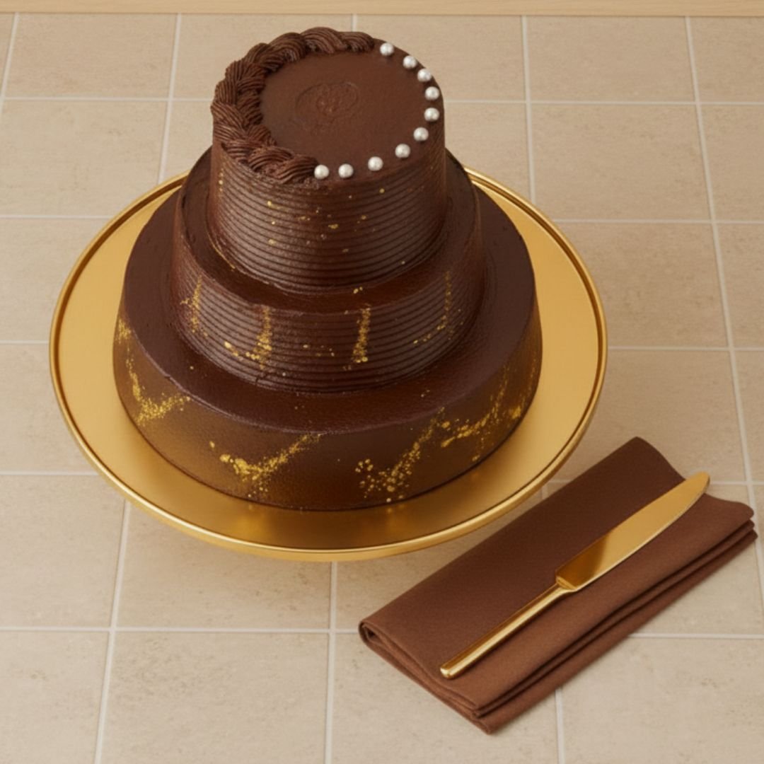 A feast for the eyes before the first bite. It is a masterclass in edible architecture. Standing tall in three perfectly sculpted tiers, this cake showcases a stunning play of light and shadow—from the intricate, hand-piped ridges that catch the eye to the ethereal shimmer of edible gold dust dancing across its base. Crowded with a halo of luminous pearls, the deep, matte velvet of the Belgian chocolate provides a dramatic backdrop for its luxurious accents. This isn’t just a dessert; it is a centerpiece designed to captivate the room and turn any table into a gallery of modern elegance.