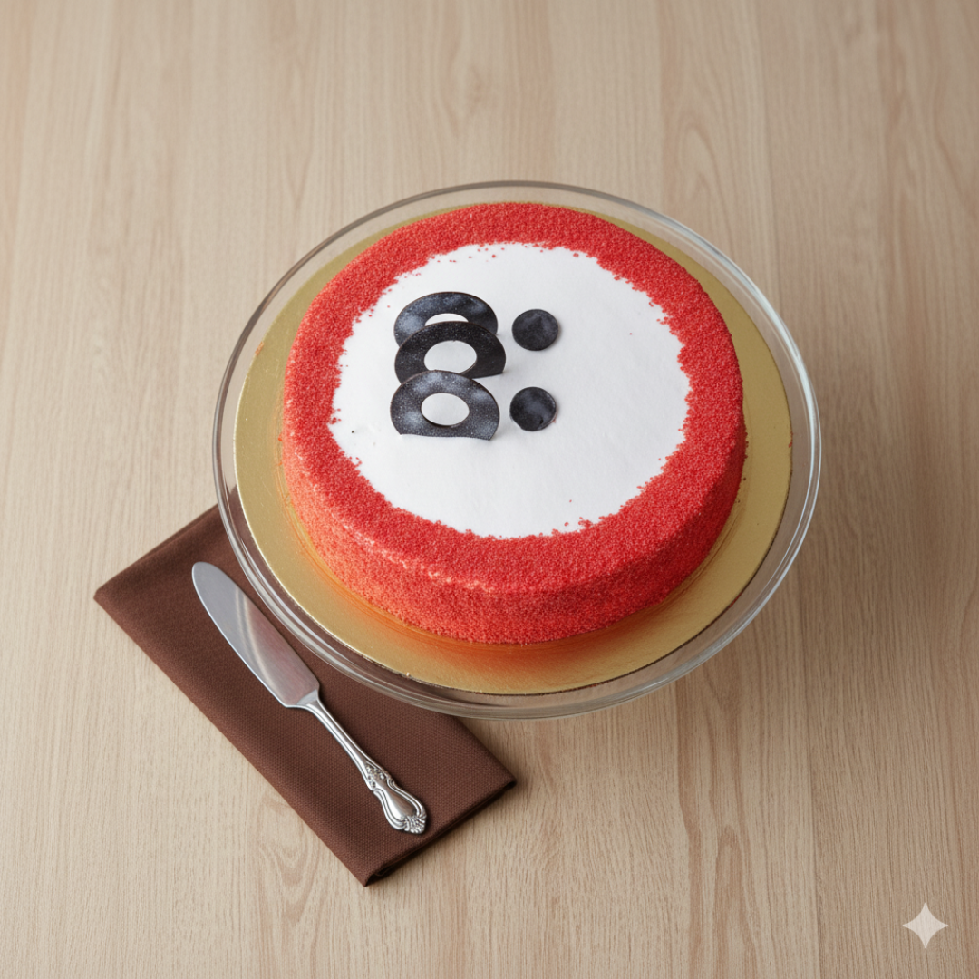 Discover a chic and delightful red velvet cake, offering a sophisticated visual appeal. This cake is beautifully encircled with a vibrant red sprinkle border, framing a smooth, pristine white frosted center. It’s elegantly adorned with modern black ring-shaped chocolate pieces and subtle grey disc accents, creating a minimalist yet striking design perfect for any celebration.